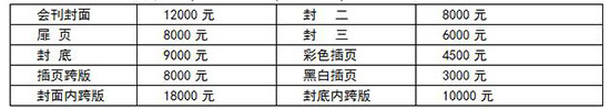 2、展會會刊:免費刊登全部參展商名錄及企業(yè)簡介。文字內(nèi)容以回執(zhí)表或郵件為準,會刊為32開(規(guī)格為210mm×142mm)銅板彩印,刊登廣告采取自愿原則,收費標準如下: